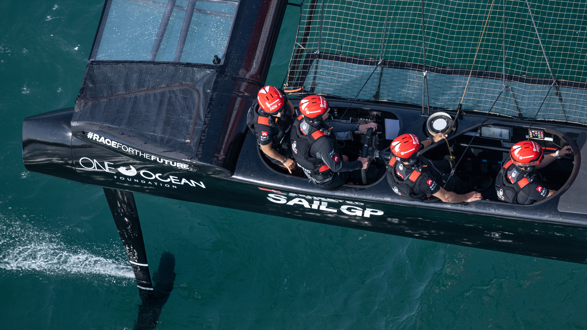 Top view of the foining F50 of the ROCKWOOL Denmark SailGP Team. The image shows what is happening under the water and how the catamaran is 'flying'