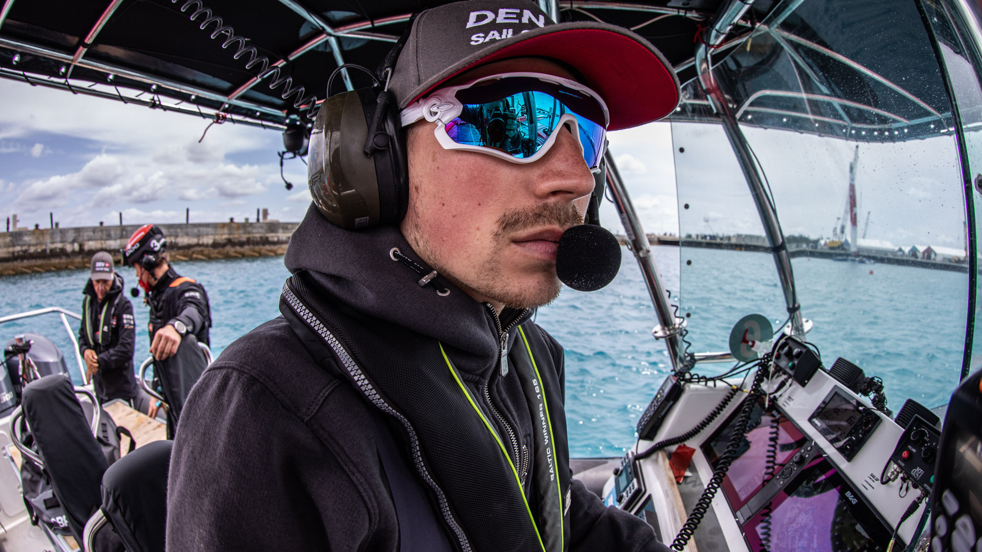 ROCKWOOL Denmark SailGP Team's coaching crew on the chaseboat analysing the F50s live data during race.