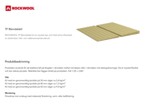 ROCKWOOL TF Ränndalskil är en mycket styv och hård skiva tillverkad av obrännbar, fukt- och vattenavvisande stenull.